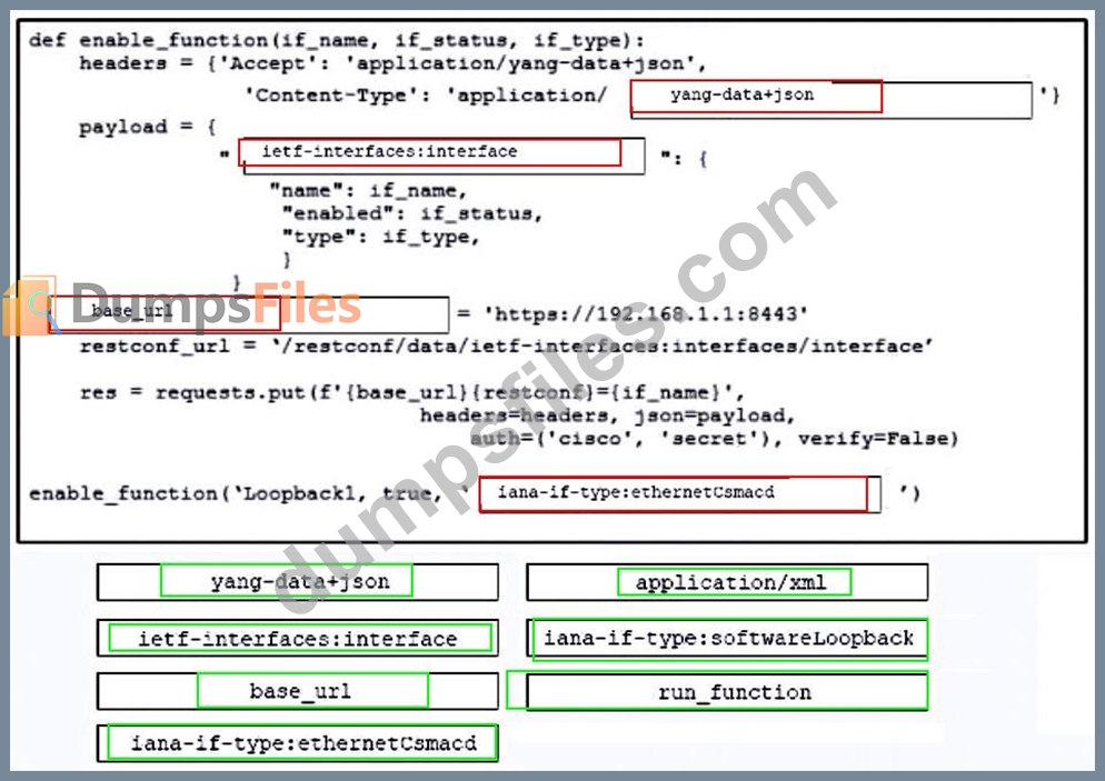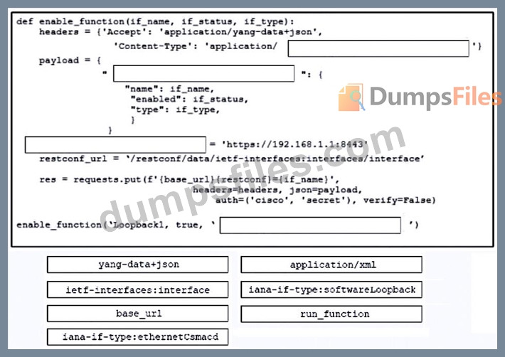 Drag and drop the code from the bottom onto the box where the code is missing to enable ports on a switch by using RESTCONF. Not all options are used.