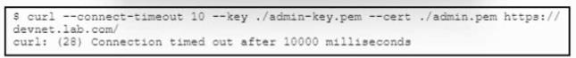 Refer to the exhibit. A developer is using cURL to test connectivity to a webpage. The request times out after 10 seconds. The developer tested connectivity by using Ping and can open a socket to the remote server by using Telnet. Other users confirm that they can access the webpage from their device. The developer has SSH access to the remote server and runs commands to troubleshoot. What causes the issue?