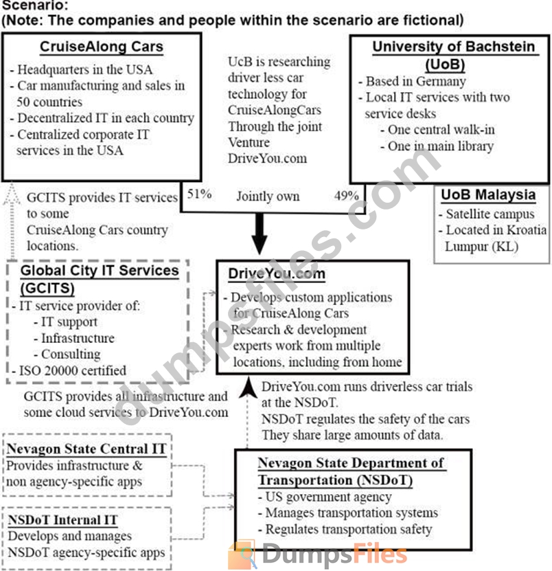 CruiseAlong Cars is a car manufacturing and sales company with corporate headquarters in the United States of America. It has grown by acquisition over the last 20 years and has operations in over 50 countries.Each country has its own IT organization, with some central corporate IT services provided by the US parent company. In some countries CruiseAlong Cars has outsourced infrastructure and service desks. The largest IT supplier is Global City IT Services (GCITS). In two countries GCITS provides CruiseAlong Cars with full outsourced services. They also provide selected services in other countries.