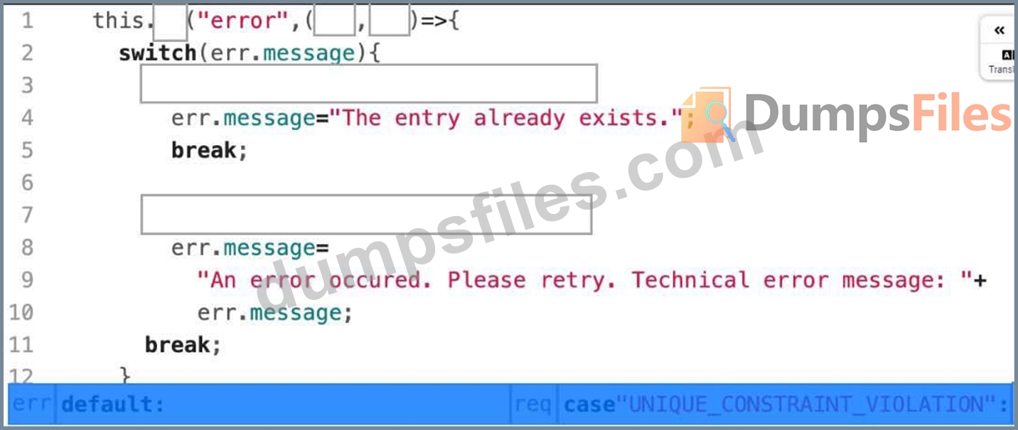 You have implemented a simple bookshop CAP application for the purpose of selling books. You want to implement an error handler in the bookshop-service, that can be used to react on specific error messages. For all other errors, you want to define a default error message. The error handler should be called during the event.Drag the code snippets from below into the correct parts of the error handler implementation.
