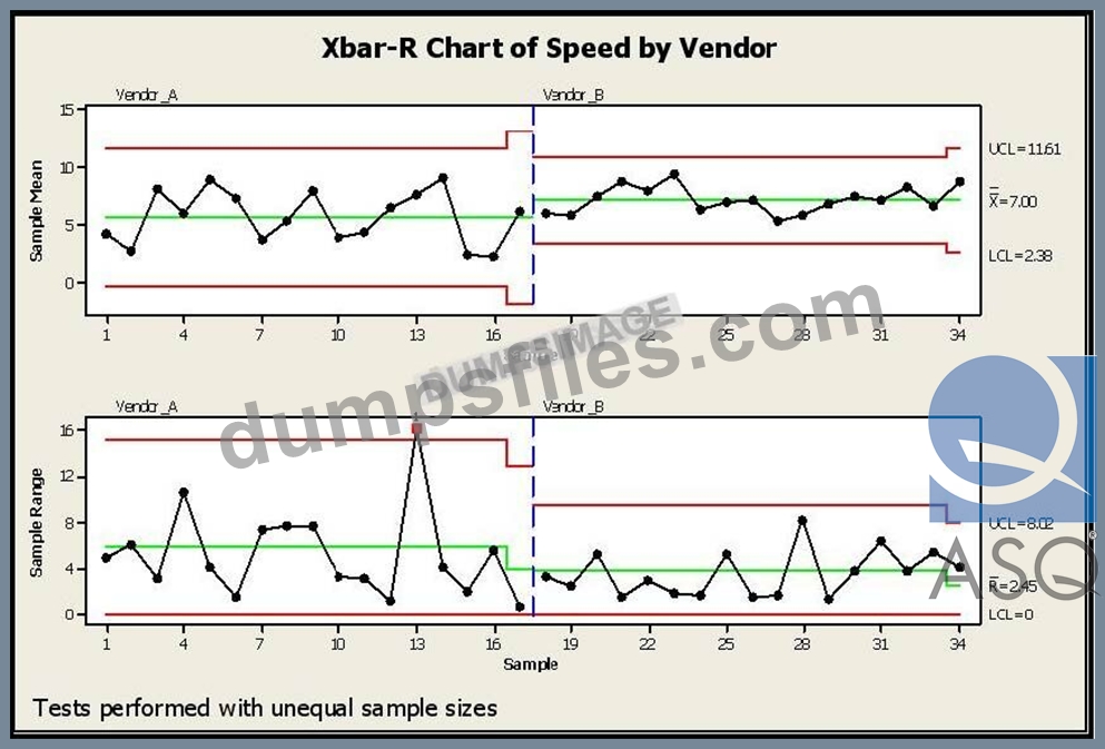SPC Charts are used extensively in different business and decision-making environments. In this example a vendor is being selected based on speed of delivery. Which of the conclusions would help you pick a vendor for your needs regarding lead-time of delivery from your vendors? (Note: There are 4 correct answers).