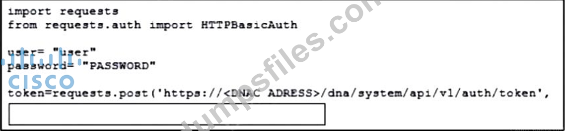 Refer to the exhibit. A developer must use a token to collect data from Cisco DNA Center API and prepares a Python script to send requests. Which line of code needs to be placed on the snippet where the code is missing to obtain a token from the Cisco DNA Center API?