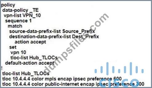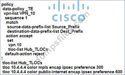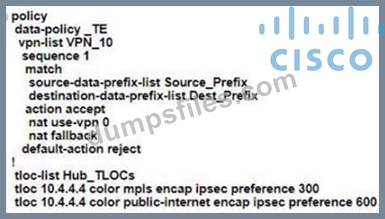 - Q295. An engineer creates this data policy for DIA for VPN 10: (Exhibit) Which policy sequence e...