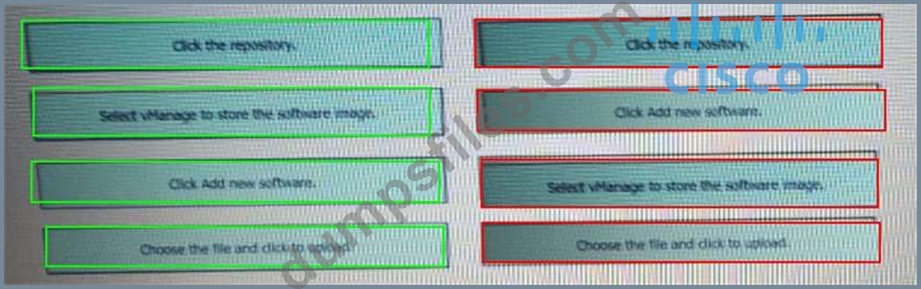 Drag and drop the steps from the left into the order on the right to upload software on vManage repository that is accessible from maintenance > Software Repository.