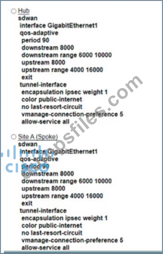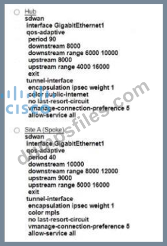 Refer to the exhibit An engineer must configure a QoS policy between me hub and site A (spoke) over a standard internet circuit where traffic shaping is adjusted automatically based on evaiiabks bandwidth Which configuration meets the requirement?