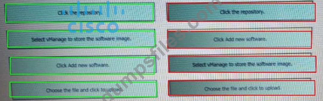 Drag and drop the steps from the left into the order on the right to upload software on vManage repository that is accessible from maintenance > Software Repository.