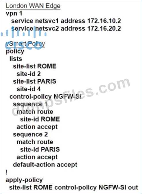 Refer to the exhibit. The Cisco SD-WAN is deployed using the default topology. The engineer wants to configure a service insertion policy such that all data traffic between Rome to Paris is forwarded through the NGFW located in London. Which configuration fulfills this requirement, assuming that the Service VPN ID is 1?