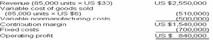 Under variable costing, the product cost includes only variable manufacturing costs. All fixed costs are expensed in the period incurred. Unit product cost under variable costing is US $6 $600.000 100,000 units produced).