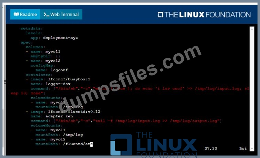 * The adapter-zen sidecar container should read /tmp/log/input.log and output the data to /tmp/log/output.* in Fluentd JSON format. Note that no knowledge of Fluentd is required to complete this task: all you will need to achieve this is to create the ConfigMap from the spec file provided at /opt/KDMC00102/fluentd-configma p.yaml , and mount that ConfigMap to /fluentd/etc in the adapter-zen sidecar container