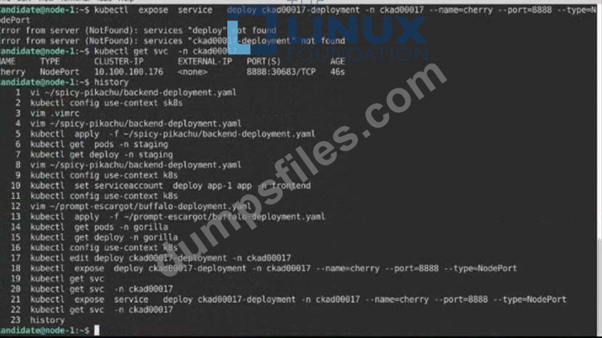 2) Next, Create a NodePort Service named cherry in the ckad00017 nmespace exposing the ckad00017-deployment Deployment on TCP port 8888
