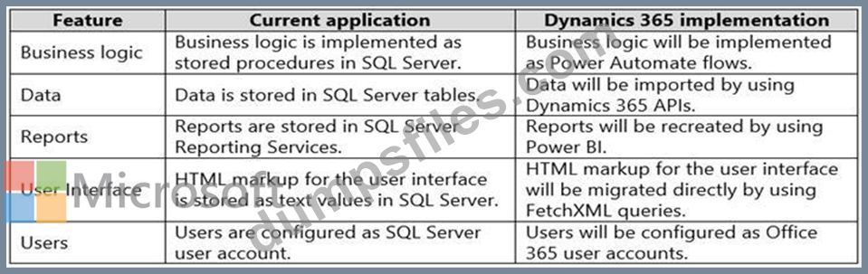 A company uses a legacy finance application that runs on a single SQL Server instance. The company plans to implement Dynamics 365 Finance. The following table describes the current implementation and design decisions for the new implementation: