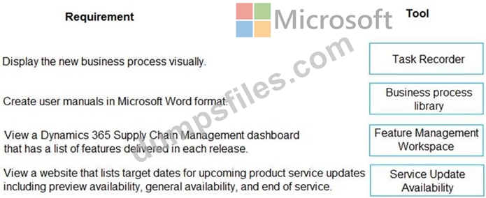 What should you recommend? To answer, drag the appropriate tools to the correct requirements. Each tool may be used once, more than once, or not at all. You may need to drag the split bar between panes or scroll to view content.