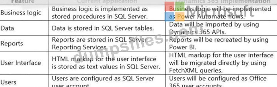 A company uses a legacy finance application that runs on a single SQL Server instance. The company plans to implement Dynamics 365 Finance. The following table describes the current implementation and design decisions for the new implementation: