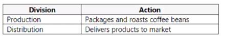 Fourth Coffee plans to implement Dynamics 365 Finance and Dynamics 365 Supply Chain Management. The company owns and operates the following divisions:
