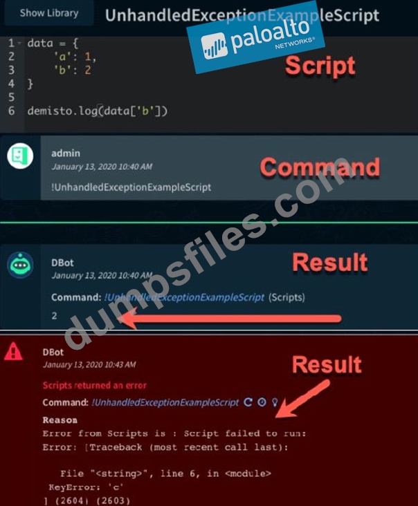 The images show two versions of the same automation script and the results they produce when executed in Demisto. What are two possible causes of the exception thrown in the second Image? (Choose two.) SUCCESS