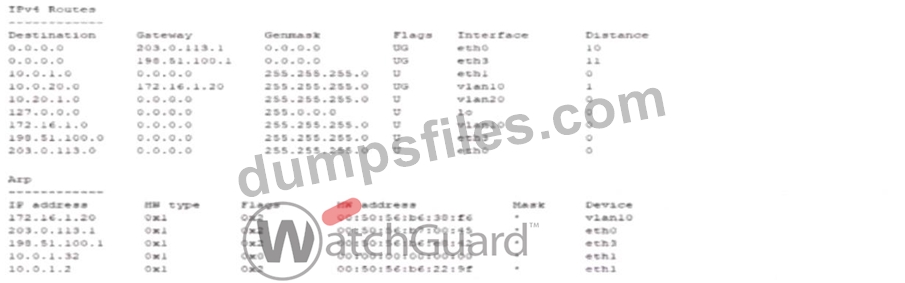* The route 0.0.0.0 with a gateway of 198.51.100.1 on the eth0 interface suggests this is the default route for outbound traffic, indicating that the Firebox's public interface (eth0) is configured to route traffic through this gateway.